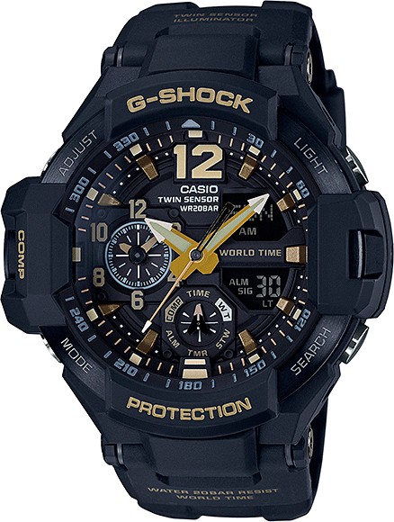 CASIO G-SHOCK Gravitymaster pánské hodinky GA-1100RG-1A - luxusní outdoorové hodinky z černé pryskyřice s funkcemi --> datum, 5x budík, stopky, odpočítávací stopky, LED osvětlení, světové časy, plně automatický kalendář, luminiscence, kompas, teploměr, funkce pohyb ručiček, tlačítko tón on/off, vodotěsnost 200 m