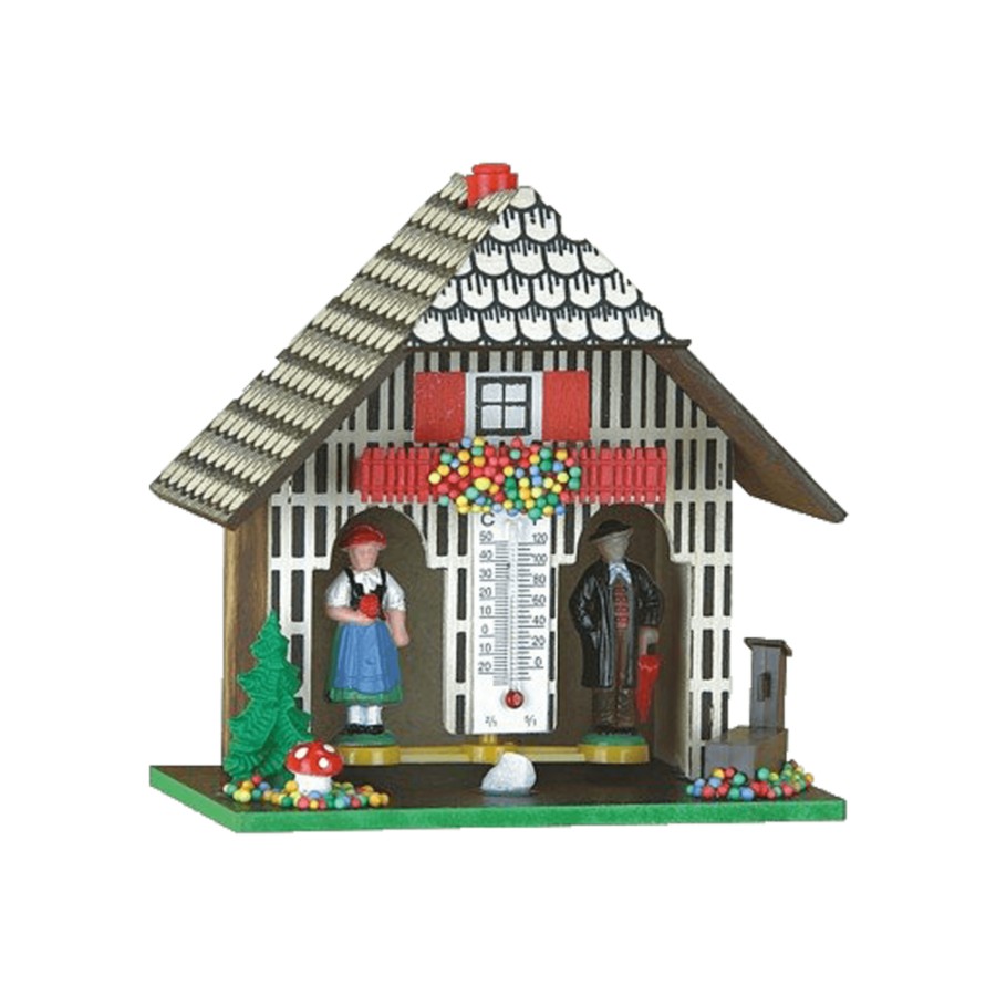 Barometr v podobě dřevěné pestrobarevné chaloupky.