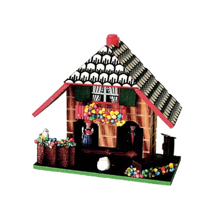 Barometr v podobě pestrobarevné dřevěné chaloupky.