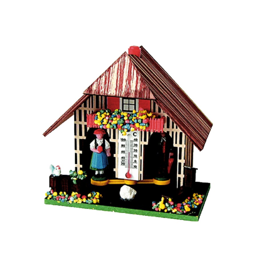 Barometr s teploměrem ve tvaru pestrobarevné dřevěné chaloupky.