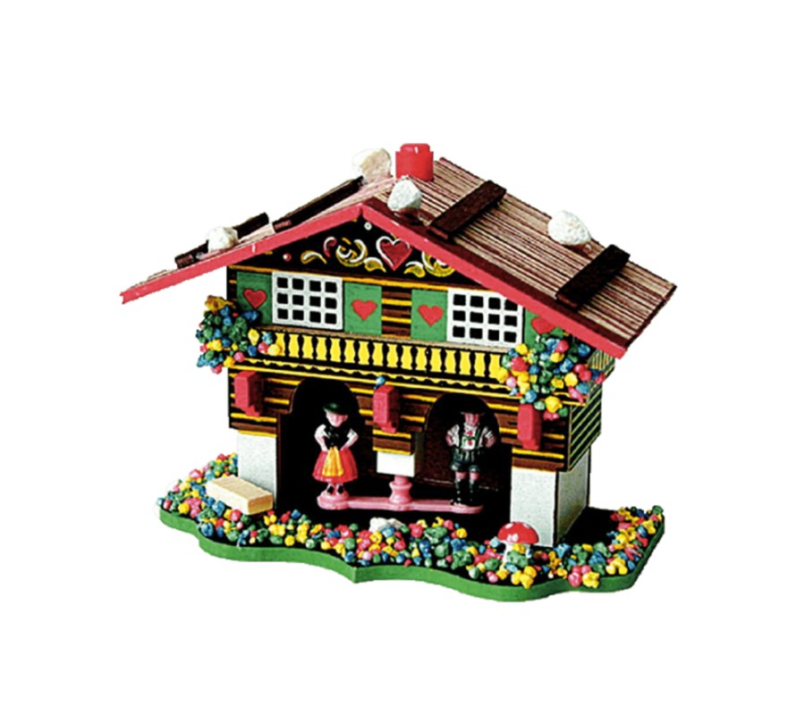 Barometr v podobě pestrobarevné dřevěné chaloupky.