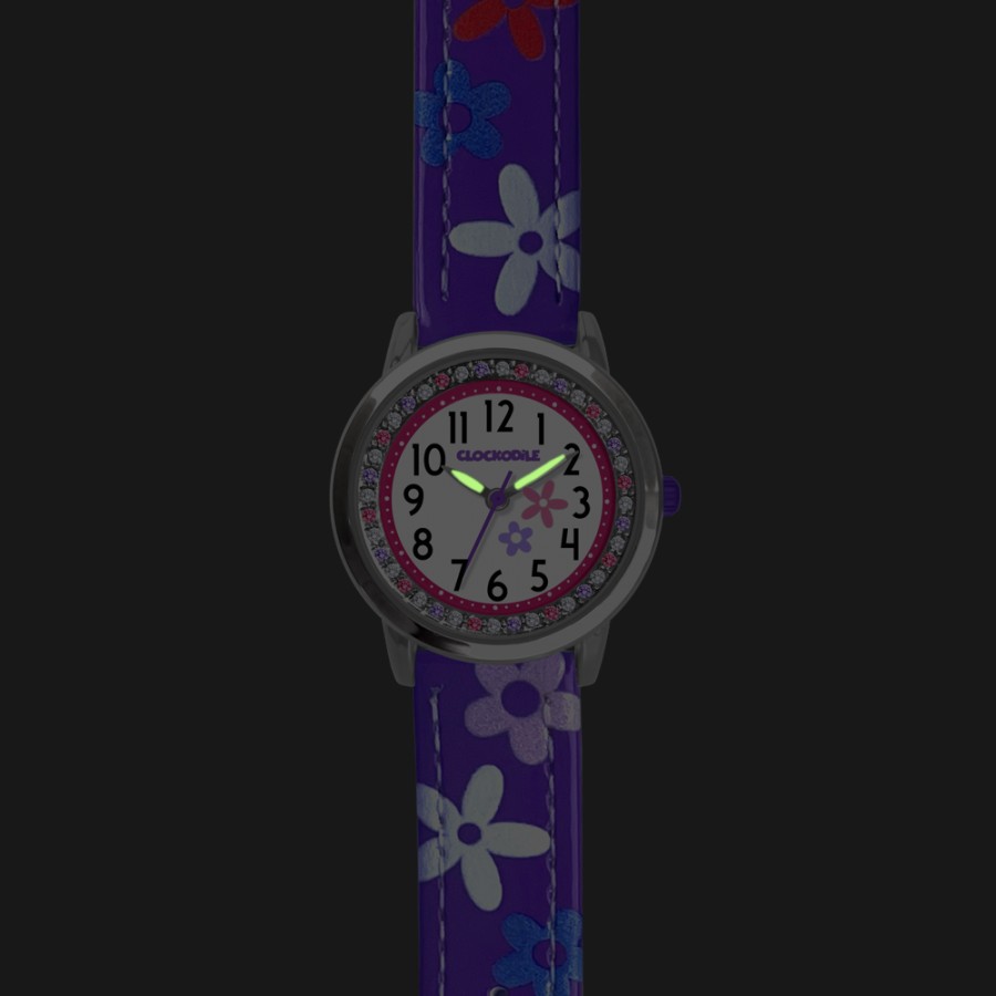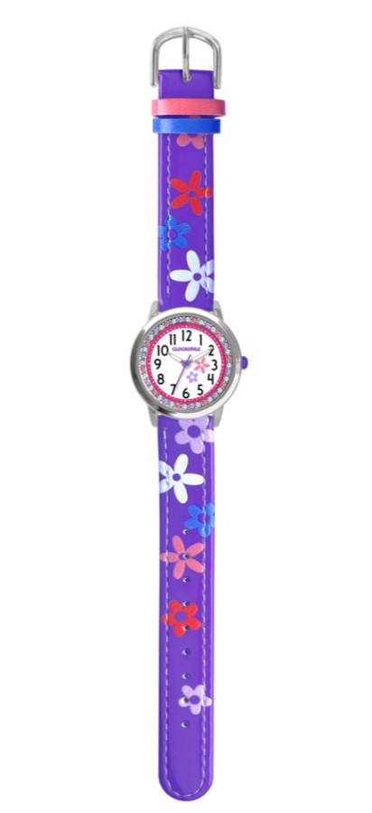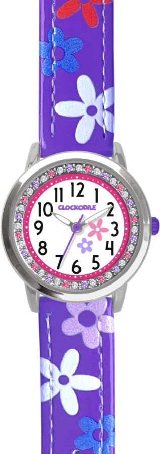 CLOCKODILE Fialové dívčí dětské hodinky s kamínky a kytičkami