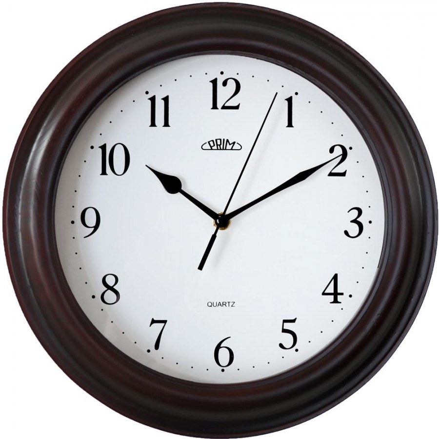 Klasické dřevěné hodiny PRIM v čistém designu s arabskými číslicemi.