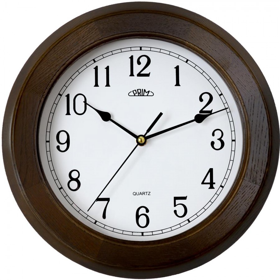 Klasické dřevěné hodiny PRIM s arabskými číslicemi.