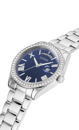 Dámské luxusní hodinky Guess Luna s ocelovým pouzdrem i řemínkem, vodotěsnost hodinek je WR30M. Průměr pouzdra je 36 mm. Hodinky mají také ukazatel data.