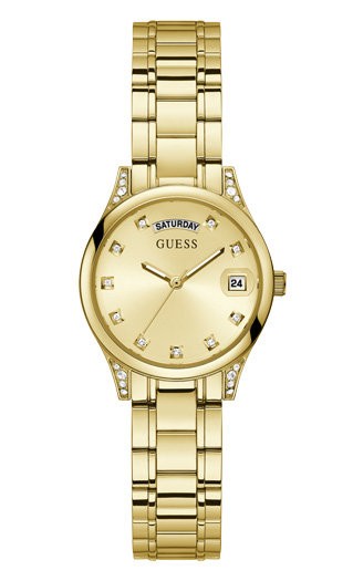 Dámské luxusní hodinky Guess Mini Aura s ocelovým pouzdrem i řemínkem, vodotěsnost hodinek je WR30M. Průměr pouzdra je 31 mm.