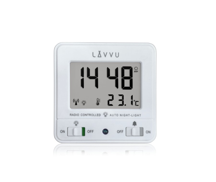 LAVVU Digitální budík řízený rádiovým signálem NORDLYS bílý se světelným senzorem