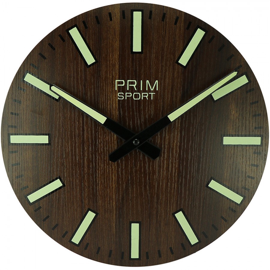 Nástěnné dřevěné hodiny PRIM Luminescent Sport II mají dýhovaný vzor a velmi výrazné sportovní indexy. Hodiny jsou vyrobeny z MDF. Nejen indexy, ale i ručičky a logo jsou potaženy luminiscenční vrstvou díky které vám budou hodiny svítit v jakékoli temné místnosti a budete tak vždy vědět kolik je právě hodin.