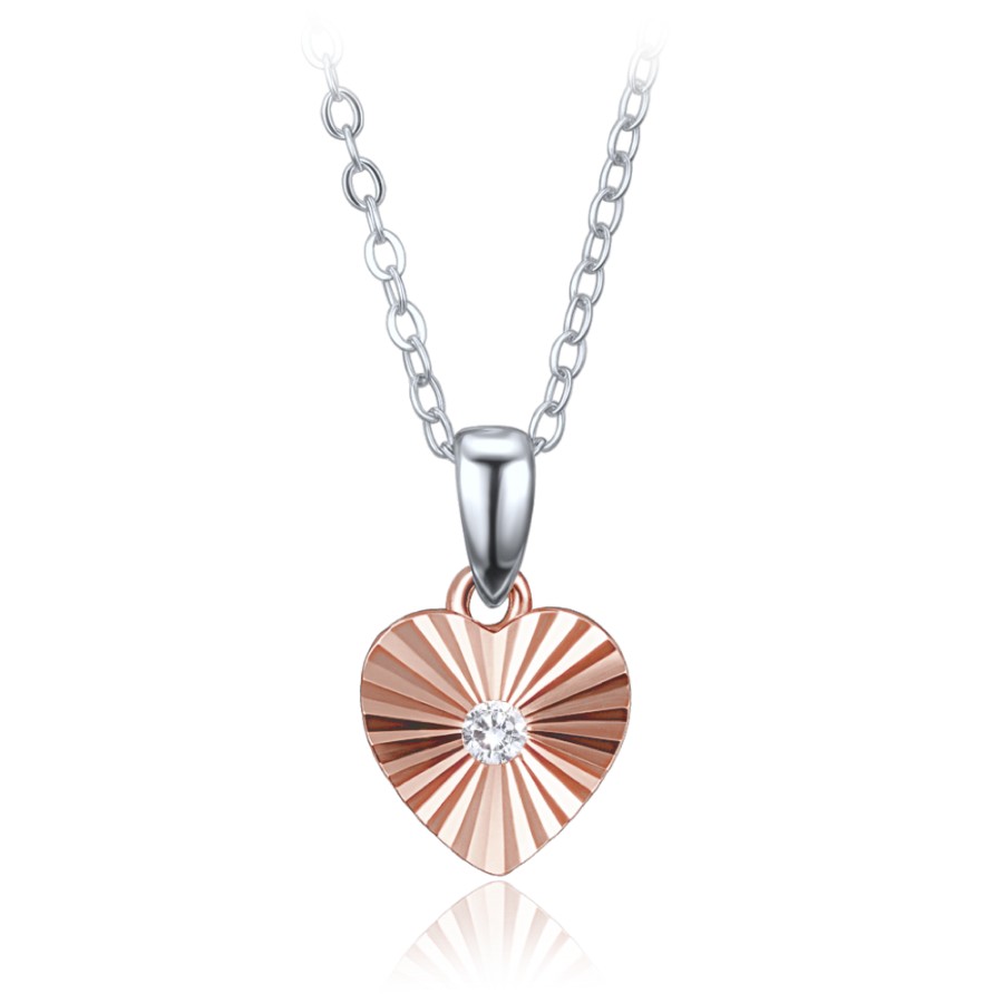Rosegold stříbrný náhrdelník MINET se srdcem a zirkonem je vyroben ze stříbra Ag 925/1000, pokovený vrstvou růžového zlata, chráněný e-coatingem a doplněný rhodiovaným řetízkem. Decentní vzhled působí jemně a elegantně.