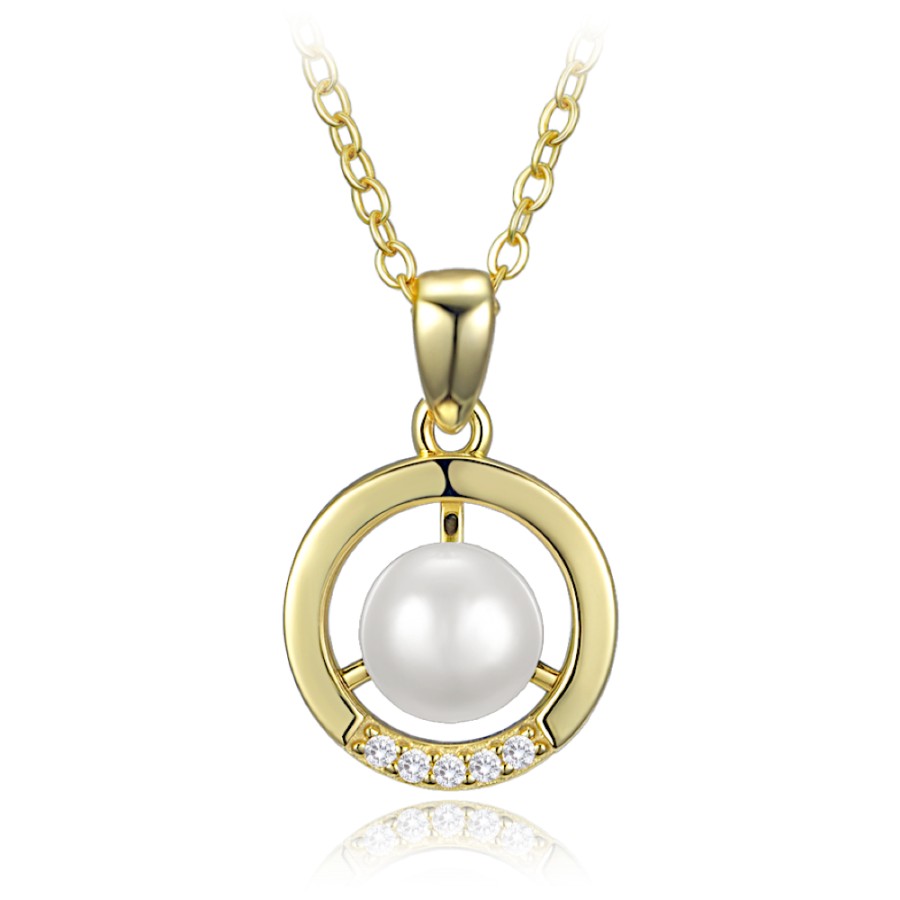 Pozlacený stříbrný náhrdelník MINET s motivem kroužku, perlou a zirkonem je vyroben ze stříbra Ag 925/1000, pokovený vrstvou zlata a chráněný e-coatingem. Elegantní vzhled je nadčasový a působí harmonicky.