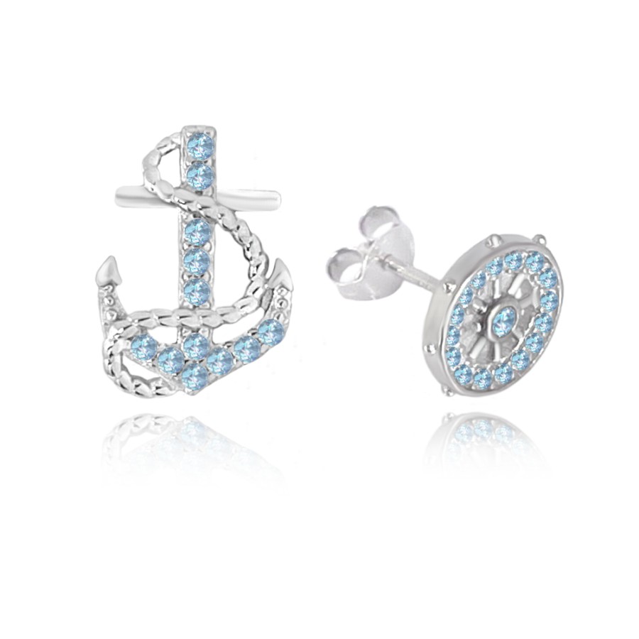 MINET Letní stříbrné náušnice KORMIDLO a KOTVA s modrými zirkony