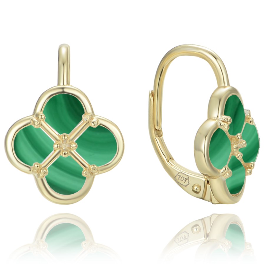 MINET Pozlacené stříbrné náušnice čtyřlístky s malachitem