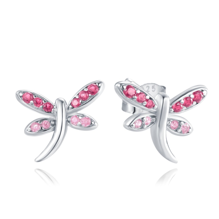 MINET Stříbrné náušnice vážky se světle a tmavě růžovými zirkony