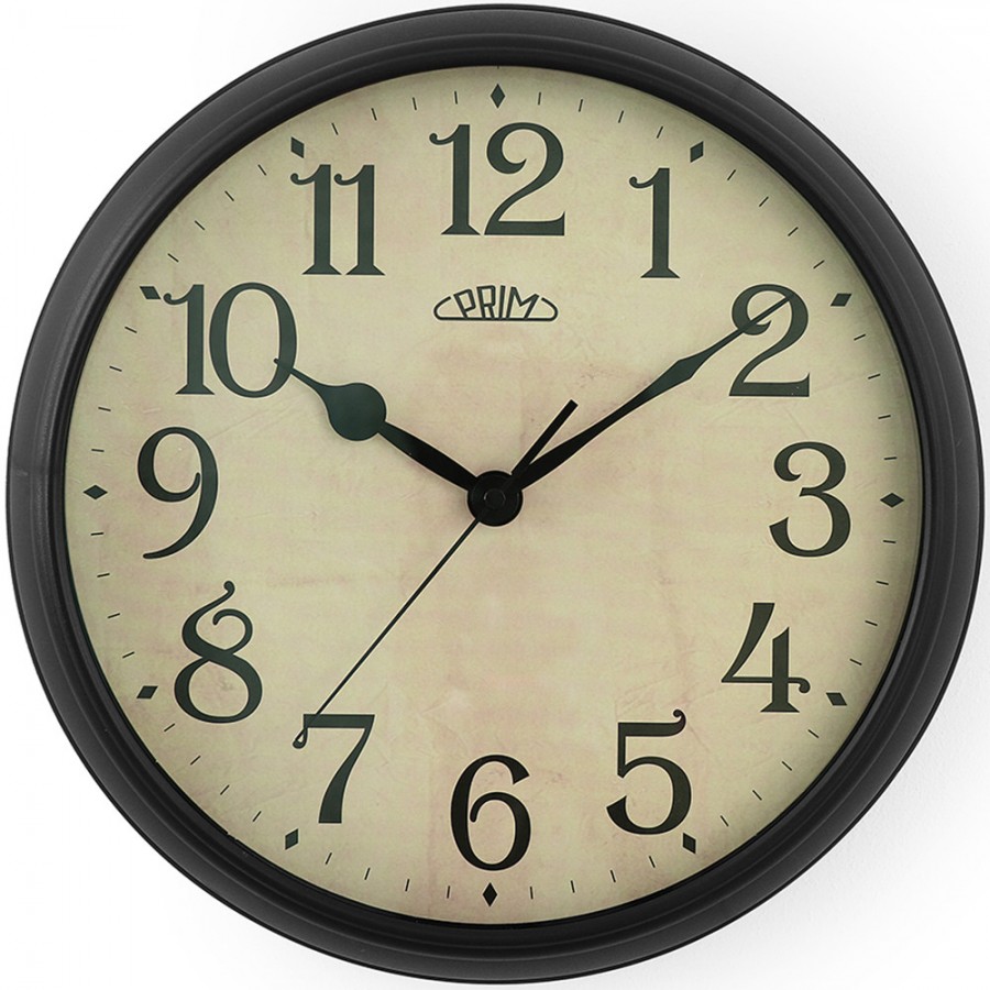 Nástěnné plastové hodiny PRIM Historic s patinovým vzorem číselníku a s elegantními retro číslicemi. Ani indexy a ručičky neunikly tomuto velmi oblíbenému designu. Uspokojí především každého, kdo má rád kousky s historickým vzhledem.