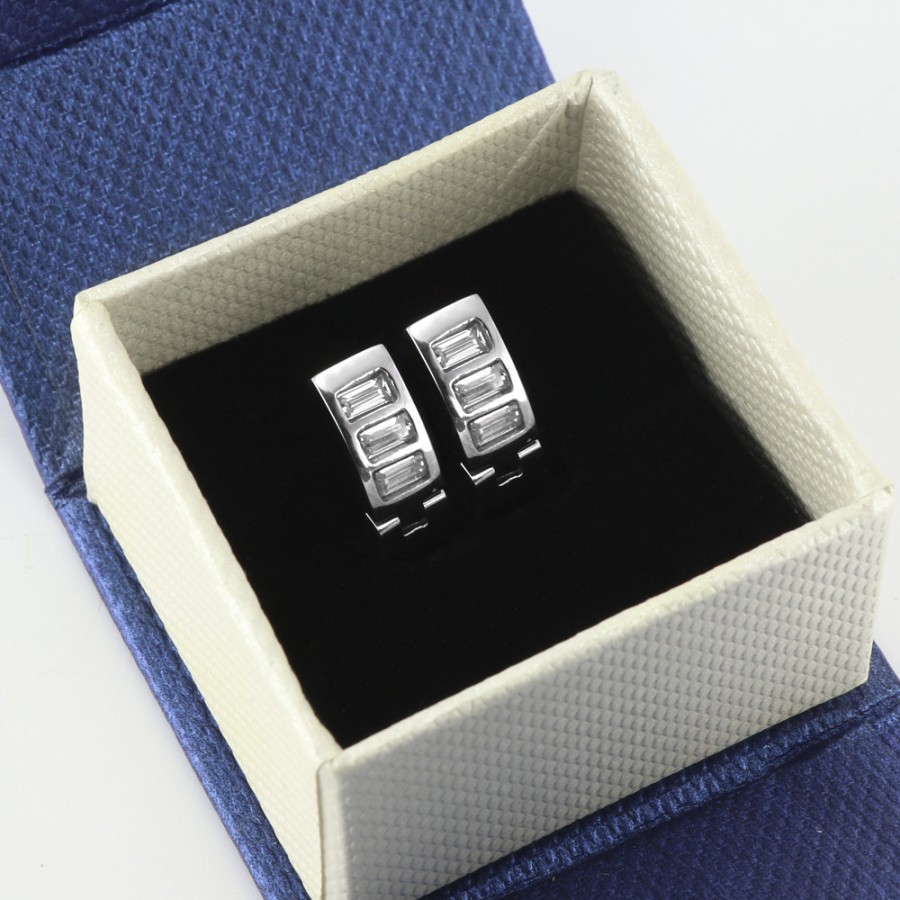 Módní dámské náušnice PRIM Steel z chirurgické oceli jsou zdobeny třemi třpytivými krystaly baquette s fazetovým brusem se zapínáním kreole.Součástí je luxusní krabička v modré metalické barvě na magnetické zavírání s logem PRIM Steel v rozměrech 5 x 5 x 3 cm.