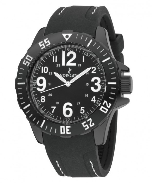 Pánské analogové hodinky NOWLEY Hot mají ocelové pouzdro, černý ciferník, minerální sklo a plastový řemínek.