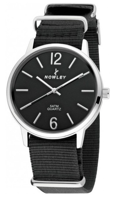 Pánské analogové hodinky NOWLEY NAVY mají mosazné pouzdro stříbrné barvy a černý ciferník, minerální sklo a černý textilní řemínek. Quartz strojek hodinek pohání baterie. Rozměry hodinek jsou 40,2 x 40,2 x 9,1 mm a vodotěsnost 5 ATM. Funkce: Hodiny, minuty, sekundy. Hodinky mají kvalitní čitelný ciferník s dobře viditelnými ručkami. Vodotěsnost hodinek 50M umožňuje i povrchové plavání ve vodě.