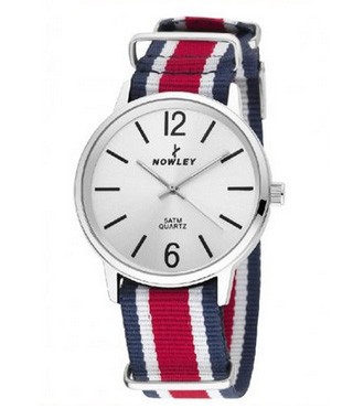 Pánské analogové hodinky NOWLEY NAVY mají mosazné pouzdro stříbrné barvy a bílý ciferník, minerální sklo a bílo-modro-červený textilní řemínek. Quartz strojek hodinek pohání baterie. Rozměry hodinek jsou 40,2 x 40,2 x 9,1 mm a vodotěsnost 5 ATM. Funkce: Hodiny, minuty, sekundy. Hodinky mají kvalitní čitelný ciferník s dobře viditelnými ručkami. Vodotěsnost hodinek 50M umožňuje i povrchové plavání ve vodě.