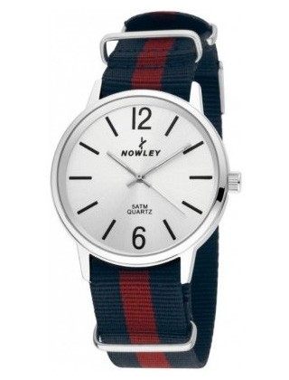 Pánské analogové hodinky NOWLEY NAVY mají mosazné pouzdro stříbrné barvy a bílý ciferník, minerální sklo a modro-červený textilní řemínek. Quartz strojek hodinek pohání baterie. Rozměry hodinek jsou 40,2 x 40,2 x 9,1 mm a vodotěsnost 5 ATM. Funkce: Hodiny, minuty, sekundy. Hodinky mají kvalitní čitelný ciferník s dobře viditelnými ručkami. Vodotěsnost hodinek 50M umožňuje i povrchové plavání ve vodě.