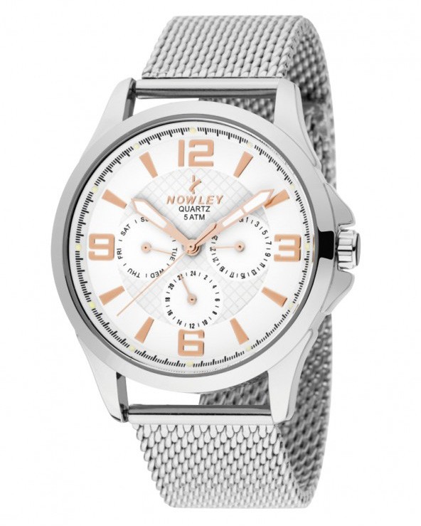 Pánské analogové hodinky NOWLEY Hot mají ocelové pouzdro, bílý ciferník, minerální sklo a ocelový tah.
