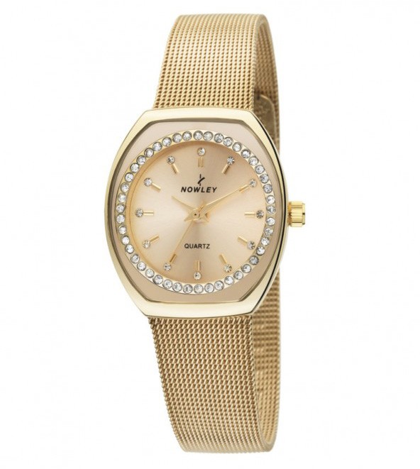 Dámské analogové hodinky NOWLEY CHIC mají mosazné pouzdro, minerální sklo a ocelový řemínek. Quartz strojek hodinek pohání baterie. Rozměry hodinek jsou 28 x 32,5 x 10 mm a vodotěsnost 3 ATM. Funkce: Hodiny, minuty, sekundy.