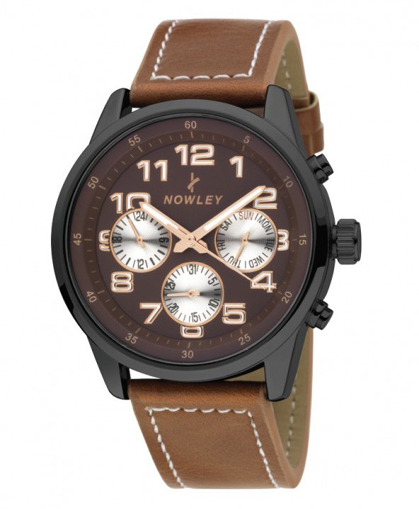 Pánské analogové hodinky NOWLEY mají mosazné pouzdro černé barvy, minerální sklo a kožený řemínek. Quartz strojek hodinek pohání baterie. Průměr hodinek je 42 mm, a vodotěsnost 10 ATM. Funkce: Hodiny, minuty, sekundy, datum, den. Hodinky jsou multifunkční, zobrazují také datum a den v týdnu.