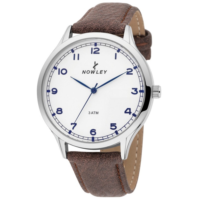 Pánské analogové hodinky NOWLEY Vintage mají mosazné pouzdro stříbrné barvy, minerální sklo a kožený řemínek. Quartz strojek hodinek pohání baterie. Průměr hodinek je 43 mm, a vodotěsnost 3 ATM. Funkce: Hodiny, minuty, sekundy.