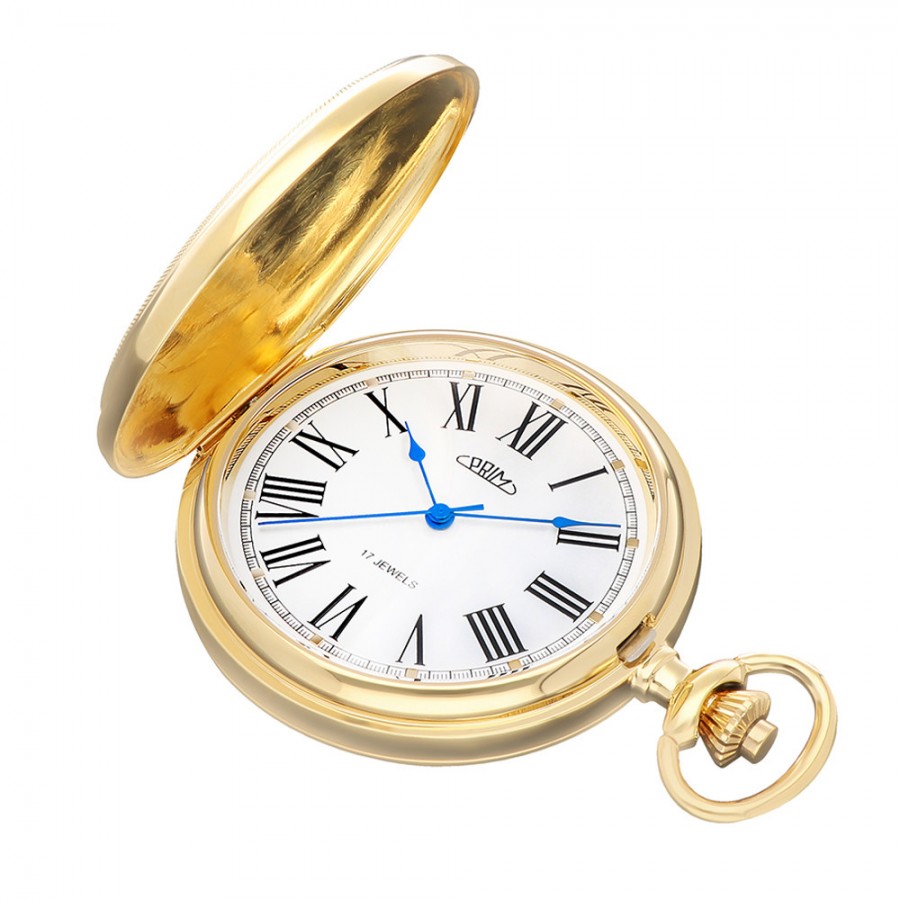 Klasické mechanické kapesní hodinky PRIM s ručním nátahem s římskymi číslicemi. Nově navržený plášť hodinek zdobí symbol českého znaku, tedy dvouocasý lev doplněný erbem, který se perfektně hodí k individualizaci monogramu. Hodinky jsou dodávány s nerezovým řetízkem.