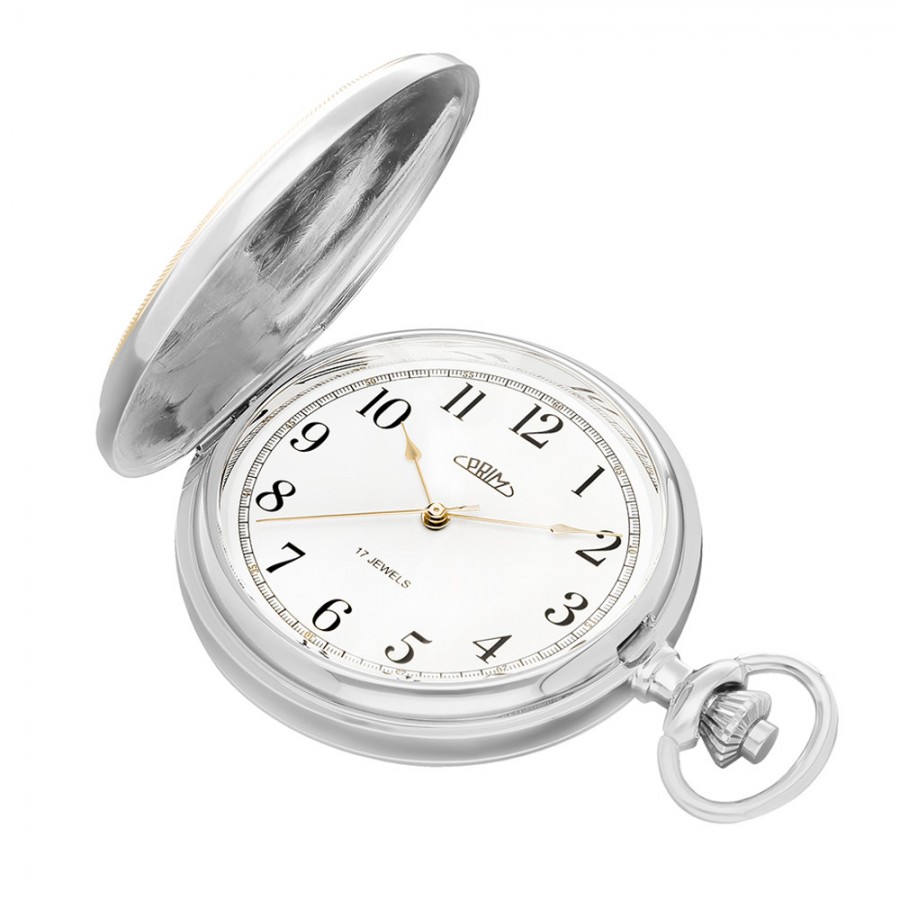 Klasické mechanické kapesní hodinky PRIM s ručním nátahem s arabskými číslicemi. Nově navržený plášť hodinek zdobí symbol českého znaku, tedy dvouocasý lev doplněný erbem, který se perfektně hodí k individualizaci monogramu. Hodinky jsou dodávány s nerezovým řetízkem.