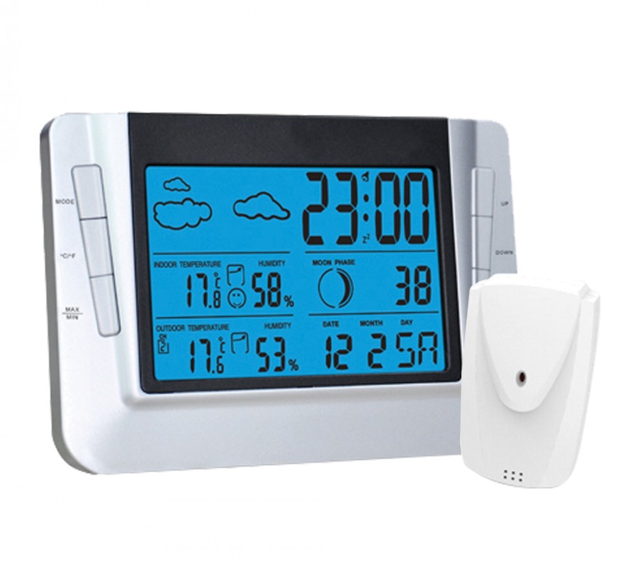 Rádiem řízená meteostanice v modrém provedení s led podsvícením vám poslouží i jako budík. Zajistí vám spolehlivou předpověď počasí, zobrazí teplotu, vlhkost vzduchu uvnitř i venku a také aktuální fázi měsíce. A to vše v sedmi světových jazycích!