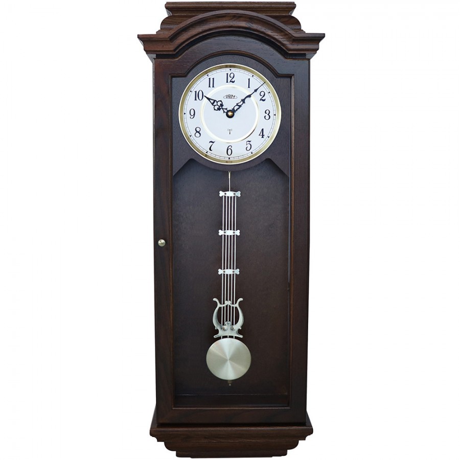 Rádiem řízené dřevěné nástěnné hodiny PRIM Radio Melody III s klasickým retro vzhledem a kyvadlem ve tvaru připomínajícím struny hudebního nástroje. Tyto kyvadlové hodiny každou hodinu přehrají melodii a odbíjí. Hlasitost odbíjení je možné nastavit nebo ho lze úplně vypnout.