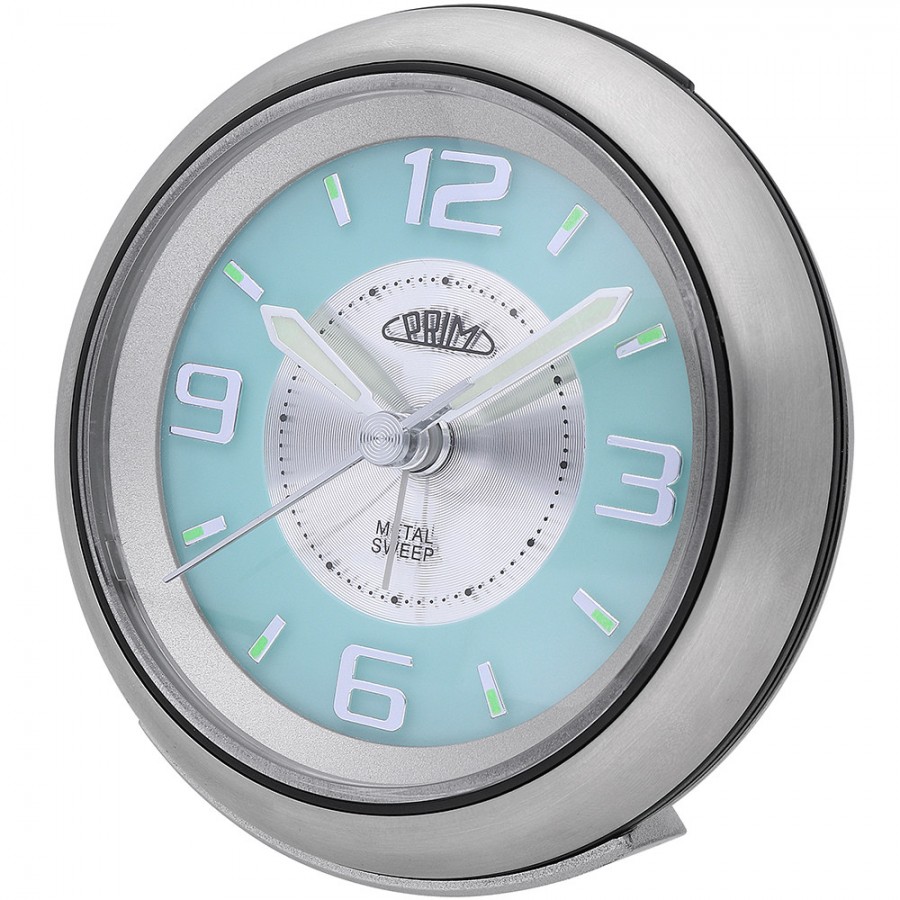 Kovový analogový budík s LED podsvícením, plynulým chodem a opakovaným buzením.