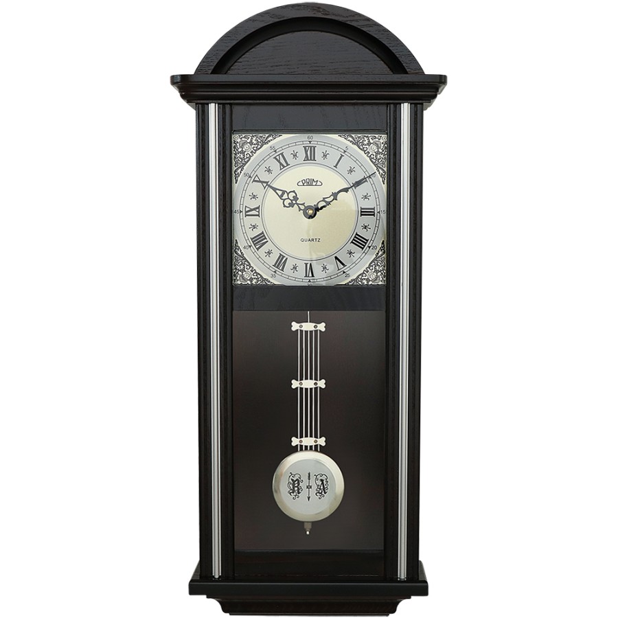 Dřevěné nástěnné hodiny PRIM v retro stylu s kyvadlem.
