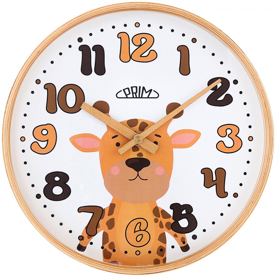 Nástěnné dětské hodiny PRIM Seti v dřevěném provedení s motivem žirafy.