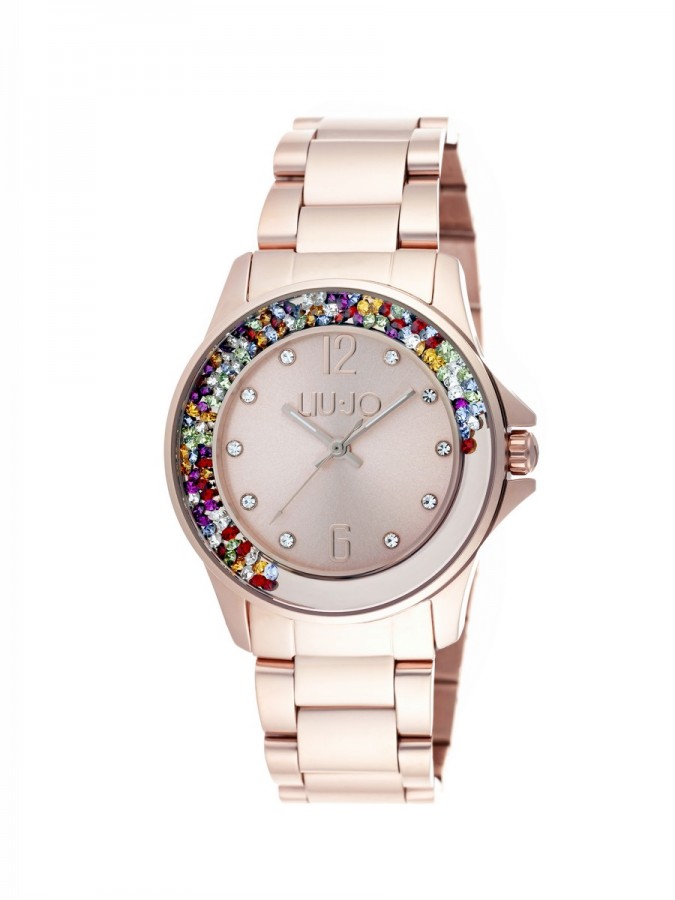 Ocelové pouzdro, zlaté barvy s kamínky.